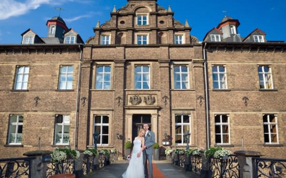 Schöne Deutsch-Amerikanische Hochzeit mit freier Trauung im Schloß Hugenpoet, Essen. Fusion-Konzept mit Fotos und Hochzeitsvideo im Kino-Look.