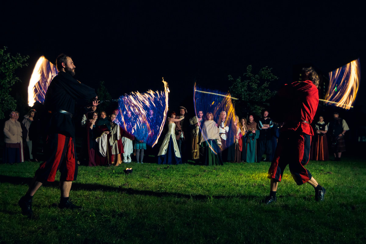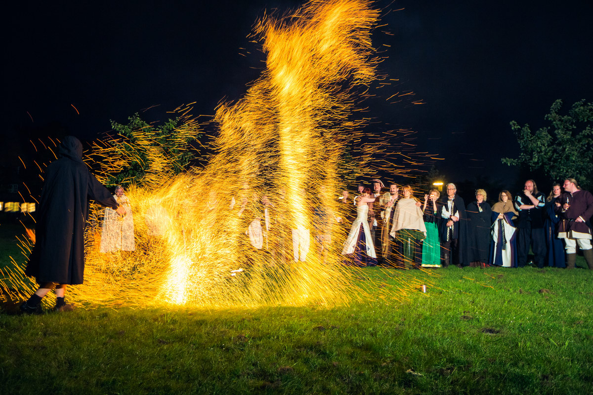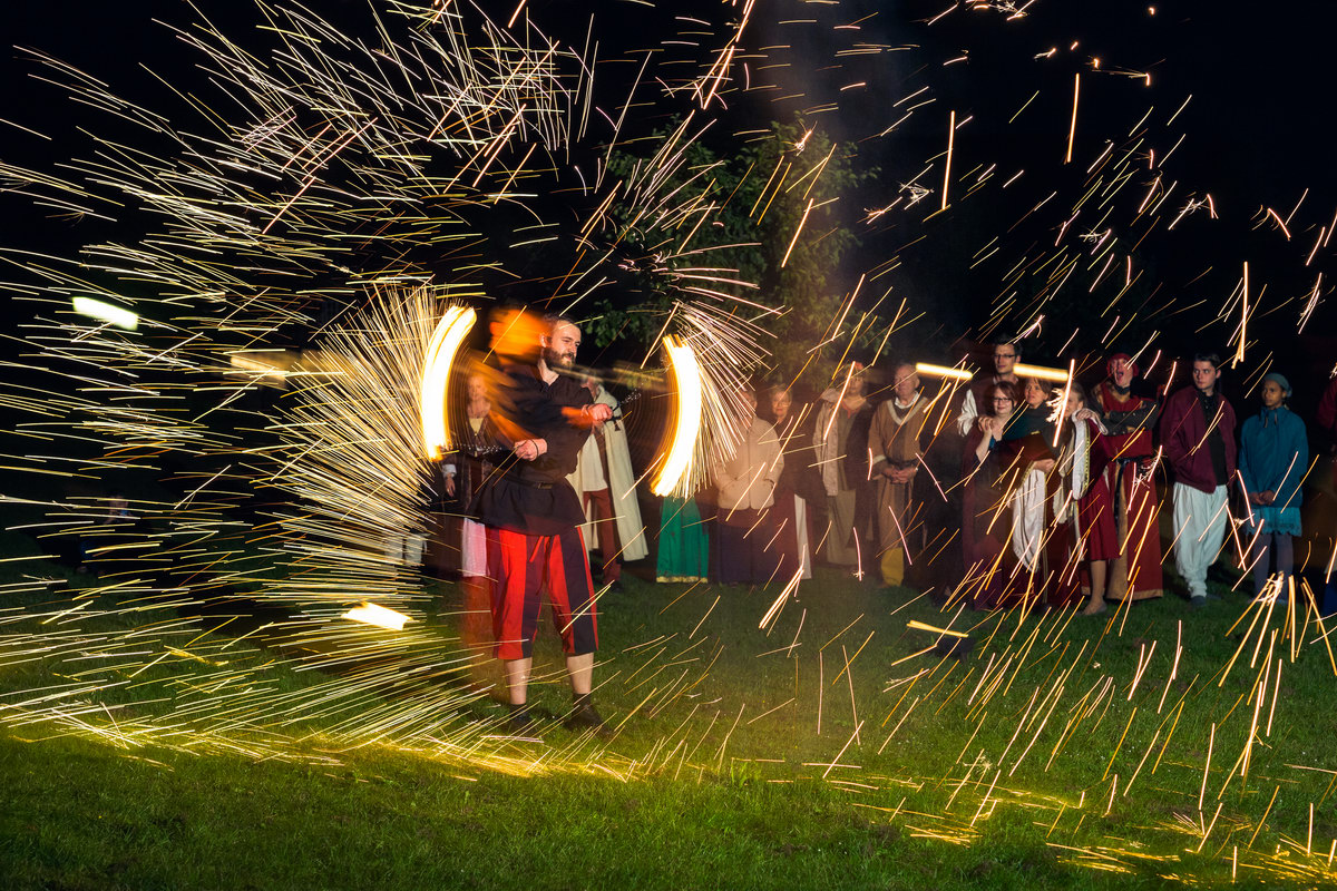 Ich kann nicht wirklich bestätigen, dass alles 100%ig authentisch mittelalterlich war (das war auch keine Absicht), aber alle Gäste (samt meiner Wenigkeit) hatten ein mittelalterliches Gewandt, es gab eine Hochzeitszeremonie mit einem uralten Brauch, es wurde Honigwein (Met) getrunken, es spielte passende Musik und nach Anbruch der Dunkelheit gab es eine grandiose Feuershow. Es ist also kein Zufall, dass an dem Tag jede Menge außergewöhnliche Motive entstanden sind.